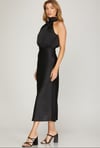 Shop this elegant black satin halter neck midi dress for women, designed with a flattering fit, open back detail, and smooth flowy fabric. Perfect for evenings, events, and special occasions. This timeless dress is recommended for chic, effortless style. Available now at Kenchima.