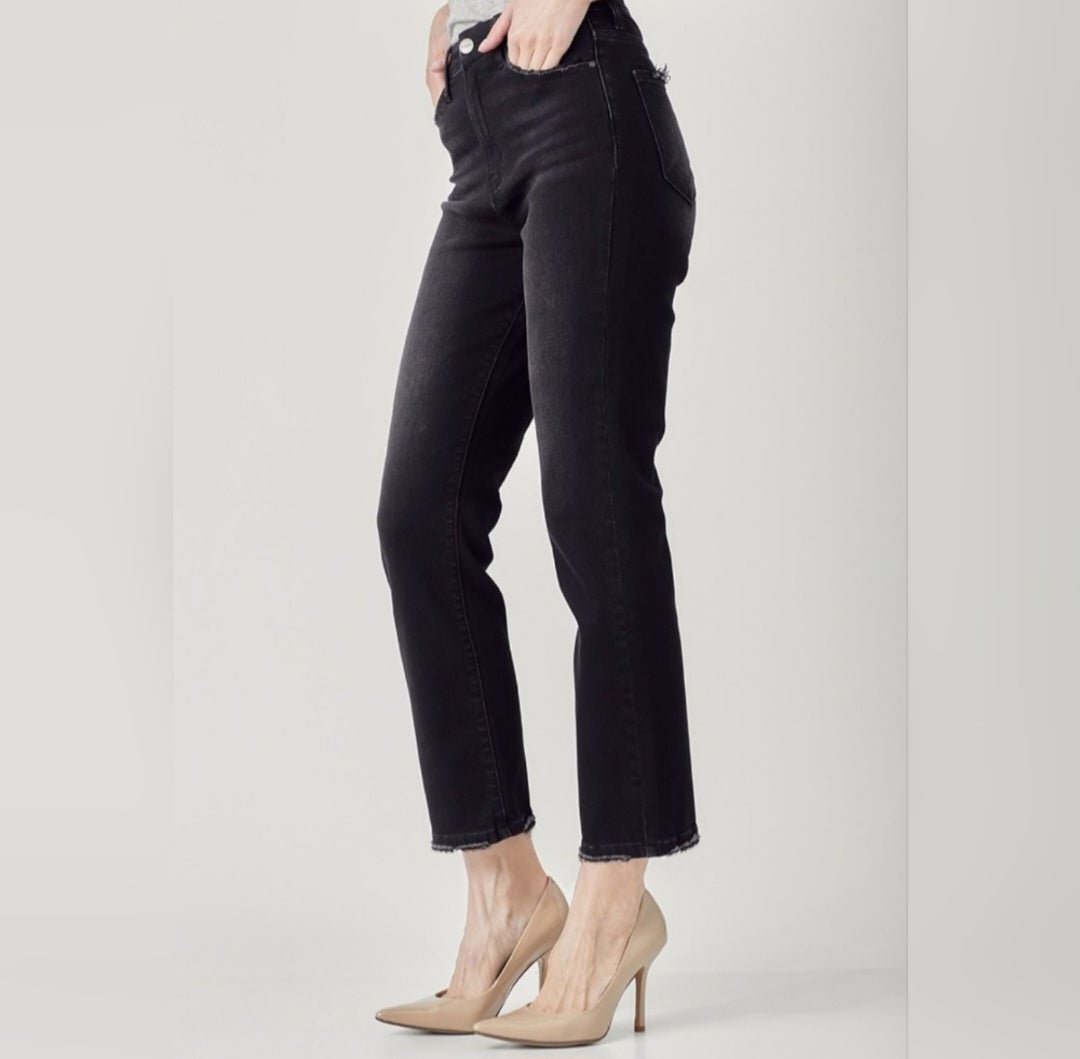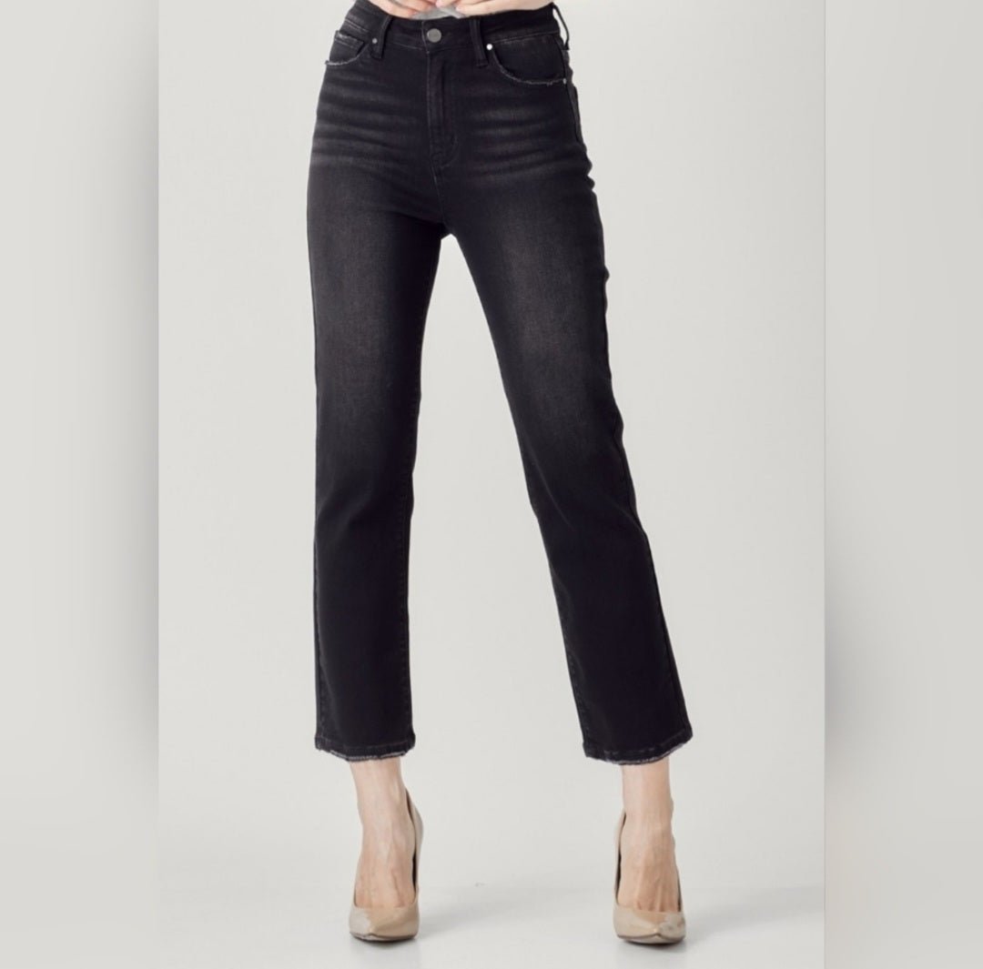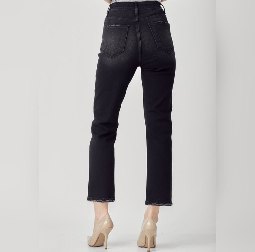 Designed with a flattering high-rise fit, these classic black denim jeans hug the waist while offering a comfortable straight-leg silhouette that elongates the legs. The ankle-length cut makes them perfect for heels, flats, or sneakers—day or night.
