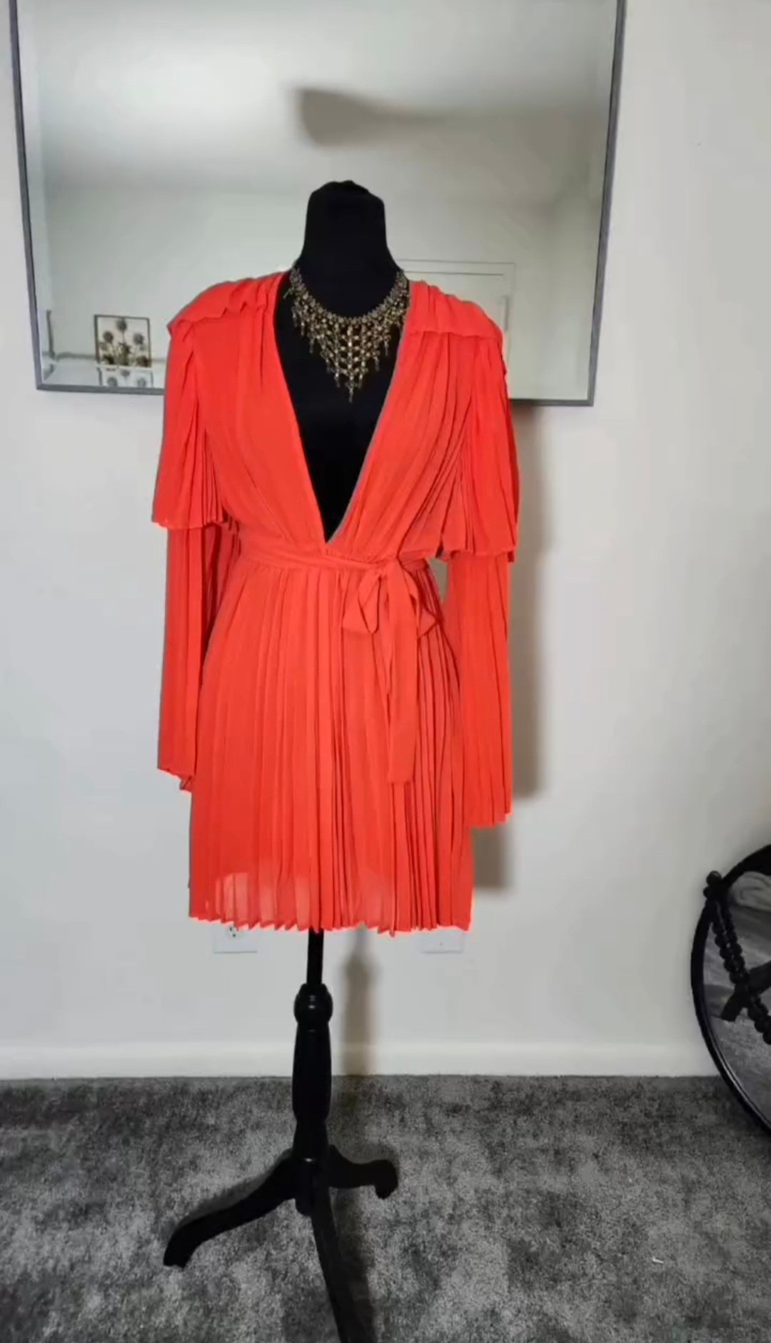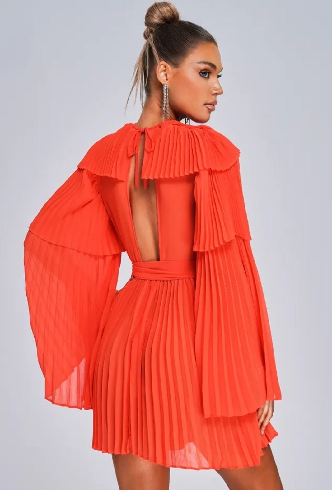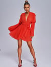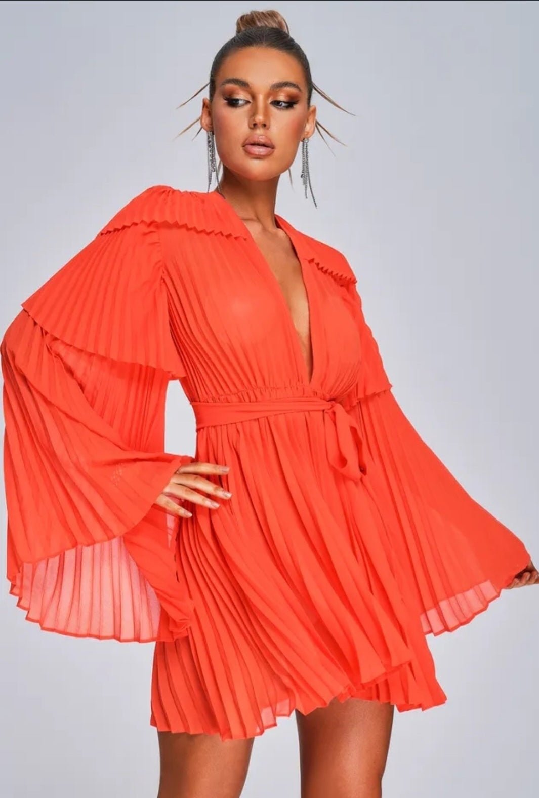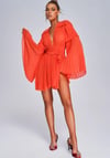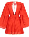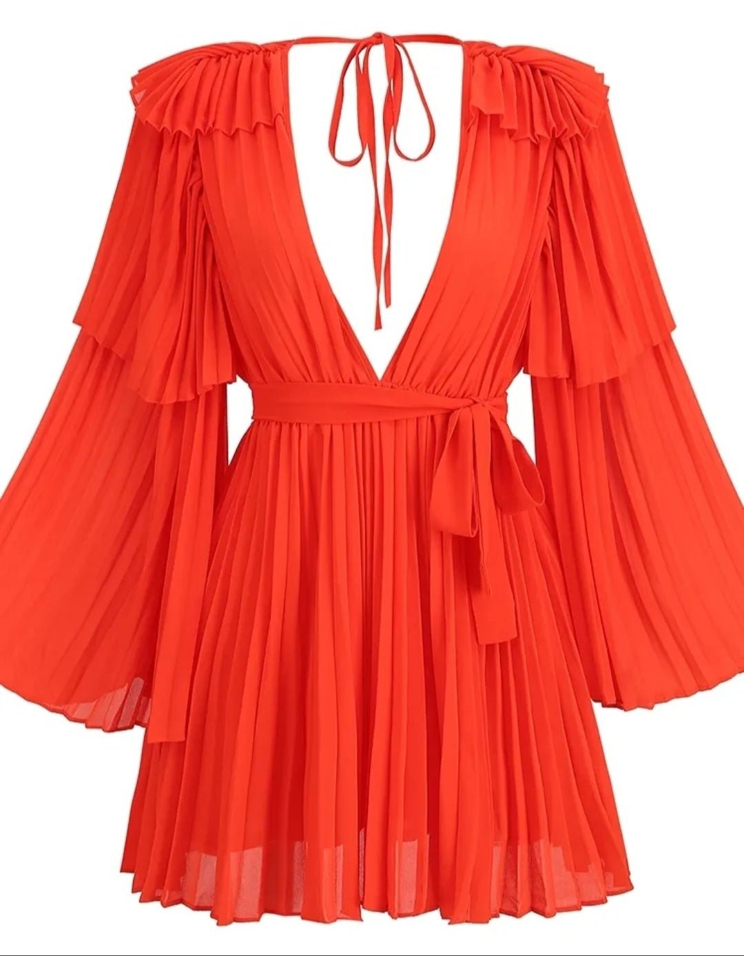 This red pleated wrap mini dress for women features long sleeves, a deep V-neckline, and a flattering tie waist design. The flowy pleated fabric creates an elegant and feminine silhouette, perfect for parties, date nights, weddings, and special occasions.