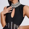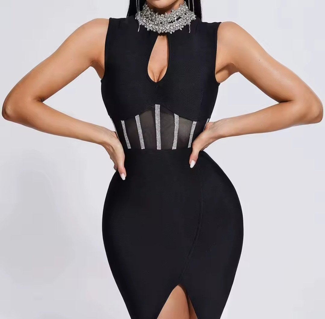 Step into elegance with this Black Sleeveless Bodycon Midi Dress, designed to sculpt your figure and elevate your night-out style. Featuring a high rhinestone choker neckline, a subtle kevhole cutout, and a sheer corset-inspired waist detail. this dress delivers a bold yet classy look.