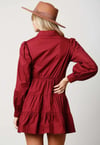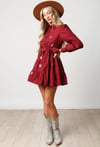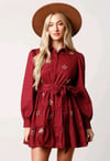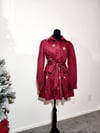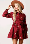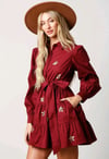Burgundy Star-Printed Belted Dress - Chic and feminine wine-red mini dress featuring flattering button-down front, puffed shoulders ong balloon sleeves, and a waist-defining belt Adorned with metallic star prints for a dreamy, stylish look. Perfect for holiday outfits, date nights, photoshoots, or fall fashion styling, Burgundy dress, star print dress, belted mini dress, fall outfit, holidav dress, balloon sleeve dress, wine red fashion, trendy mini dress.