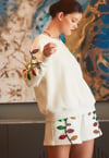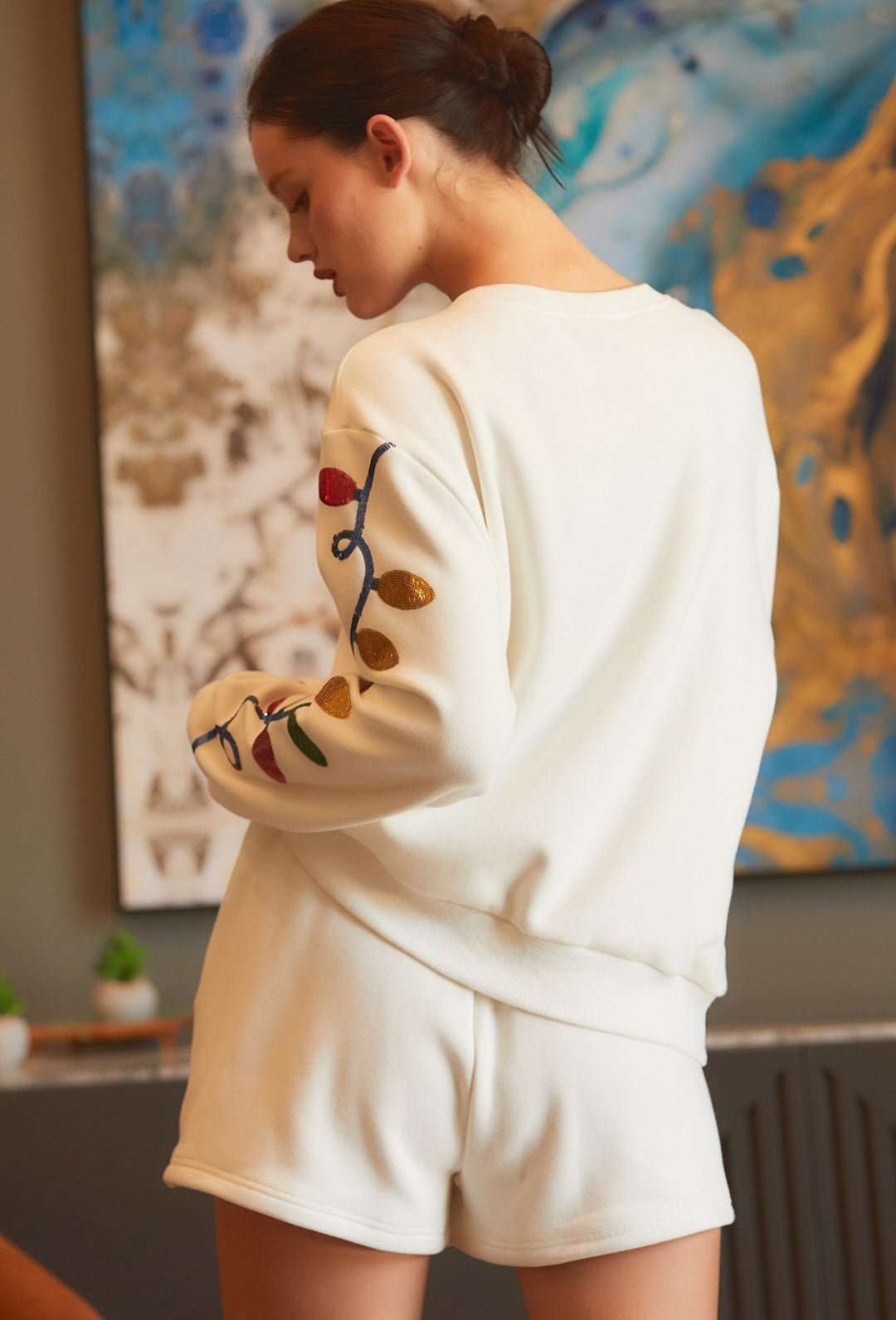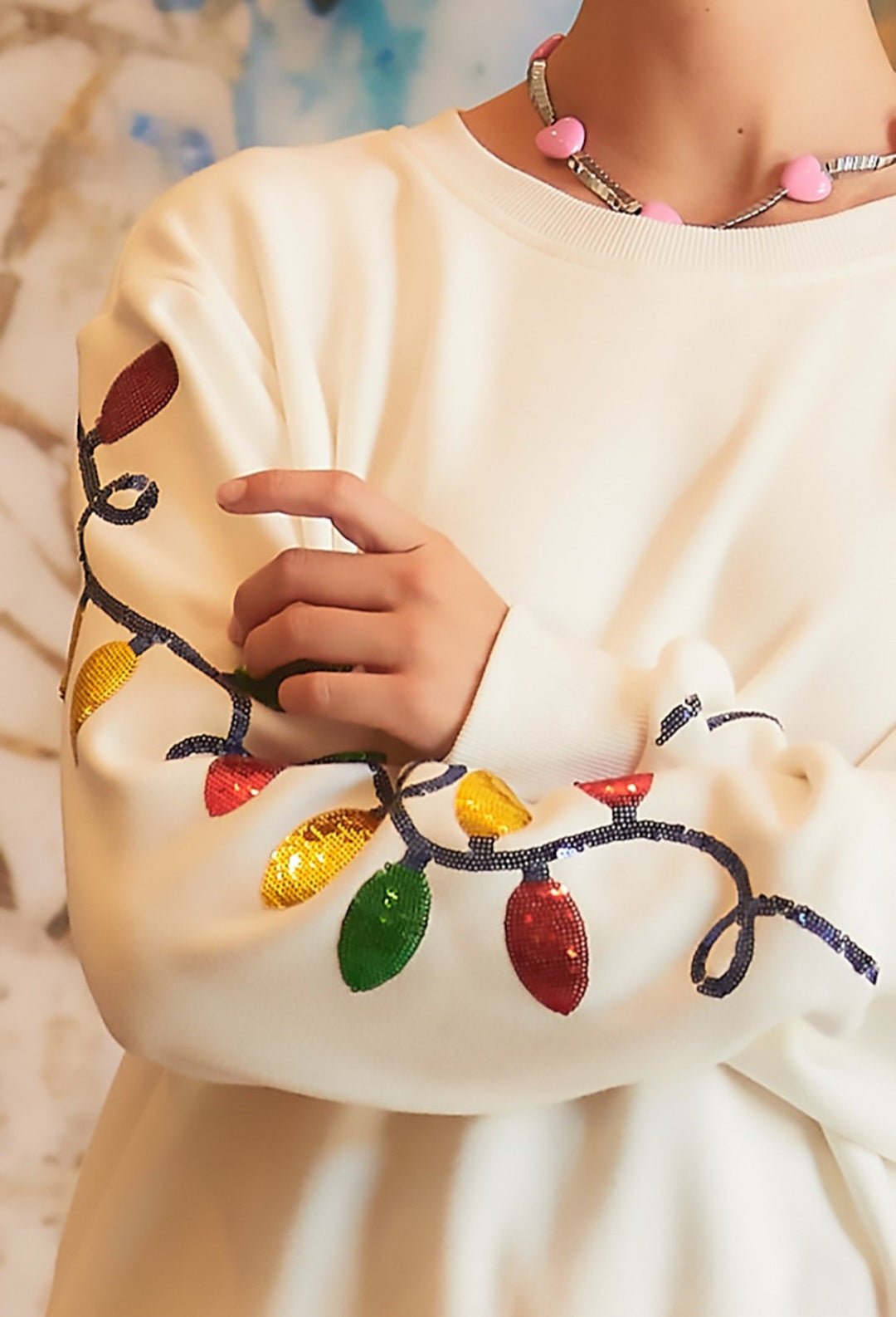 This women's cream sweatshirt features a festive sequin light design on the sleeves, adding a playful yet stylish touch to a cozy everyday essential. Designed with a relaxed fit and soft fabric, it offers comfort without compromising on style.