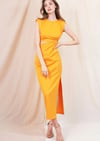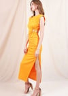 Step into confidence with this stunning orange cut-out midi dress, designed to flatter your silhouette effortlessly. Featuring a sleek sleeveless design, a stylish waist cut-out with ring detail, and a graceful side slit, this dress delivers elegance with a modern edge.