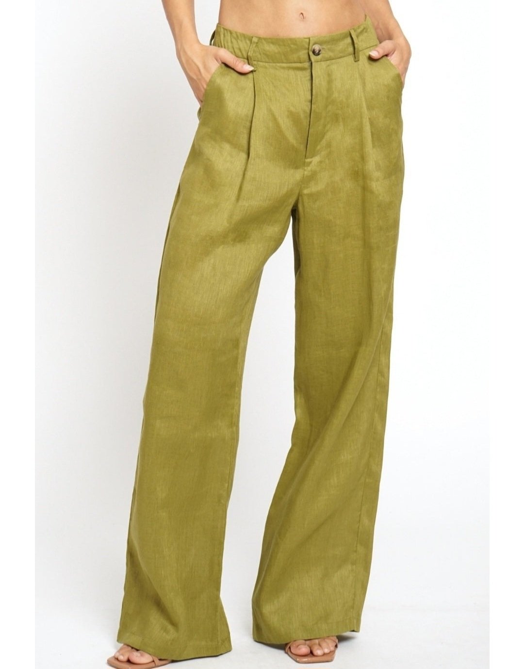Embrace effortless sophistication with these olive green wide leg linen pants that combine comfort with timeless elegance These flowing trousers feature a flattering high-waisted design with front pleats that create a relaxed yet polished silhouette perfect for both casual and dressy occasions. The rich chartreuse-olive color adds an earthy, organic touch to any wardrobe.
