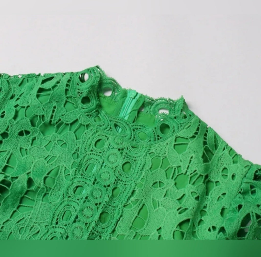 Pascale high waist midi lace dress is a type of dress that combines several elegant, luxurious and fashionable elements such as: the collar that adds a touch of sophistication and structure to the dress, the long sleeves that extends to the wrist can also add a touch of elegance, this design detail of high waist helps create an illusion of longer legs and can be flattering on various body types.