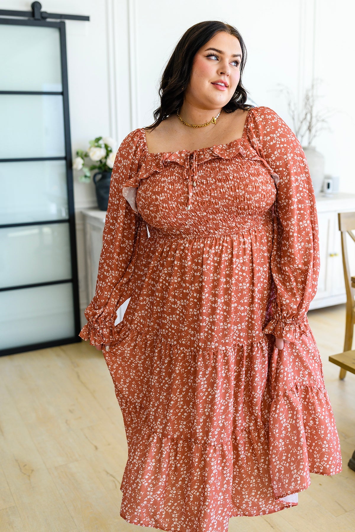 There's no better time than now to add the Now Is Your Chance Floral Midi Dress In Rust to your closet! Lightweight floral print fabric shapes an elasticated square neckline decorated with a ruffle overlay and a tie detail that tops a smocked bodice. A midi skirt features a tiered detail with long sleeves that have an elastic ruffle cuff. Pair this stunning dress with western style boots and a matching bag for a cute boho look!